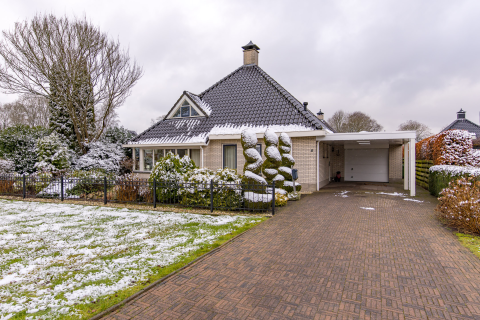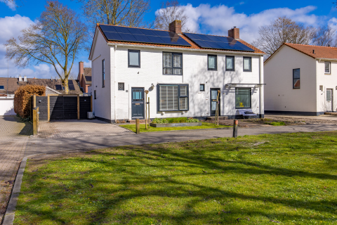 Op hoekperceel gelegen ruime helft van een dubbel woonhuis met uitbouw, aangebouwde overkapping en stenen garage op een perceel van 295 m2!